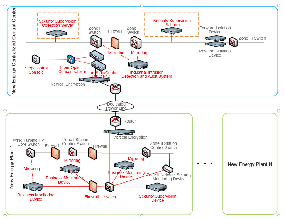 (1) New energy field station side: Achieve the collection and centralized management of assets, traffic, business, and other information within the field station, and upload them to the centralized control center. The business monitoring system enables real-time business monitoring, analyzes business data, network traffic, and business operation status in real time, including communication conditions such as automatic generation control (AGC), automatic voltage control (AVC), wind power, and PV power prediction. Additionally, it monitors the operational status of systems such as measurement and control, protection, phasor measurement unit (PMU), electricity quantity, fault recording, protection information substation, and fan operation status.