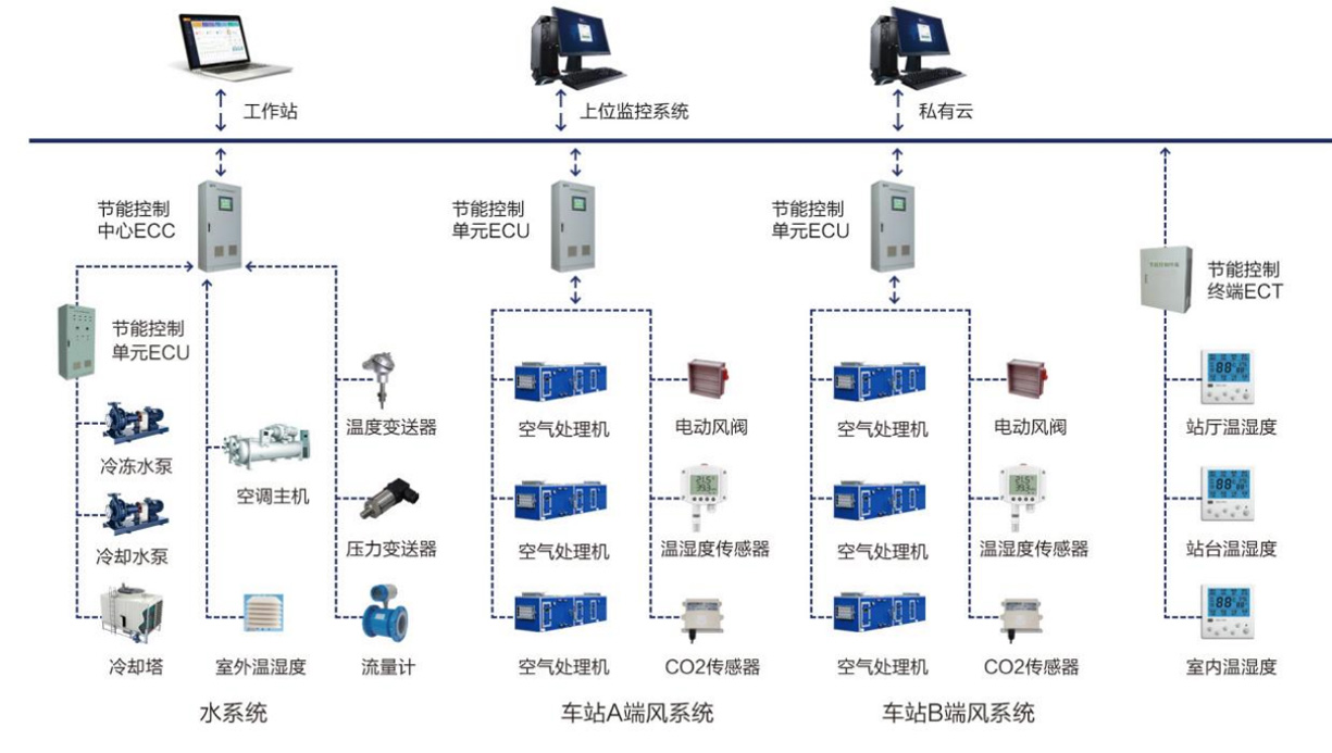 地铁节能增效系统解决方案是以智能控制为基础、以节能降耗为核心目标,并同时融合机房综合管理、系统能耗监测及大数据云服务等功能,为用户提供系统全面的节能增效和能源管理一体化解决方案。从而大幅度提高机房设备实际运行效率,提升系统运行COP,降低运营成本,提高用能质量及管理效率。